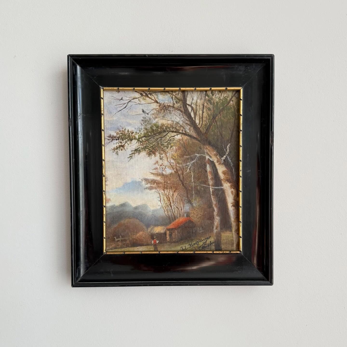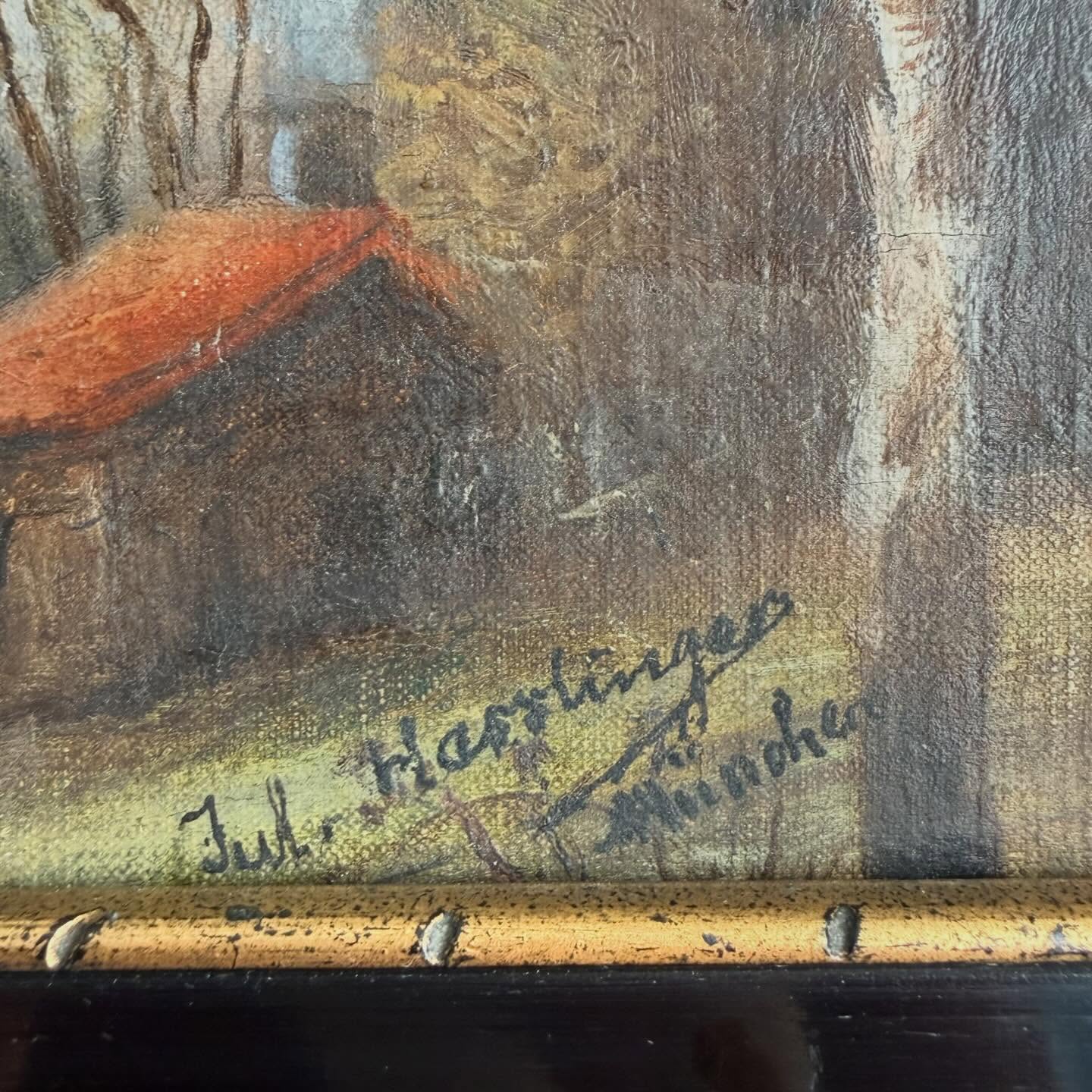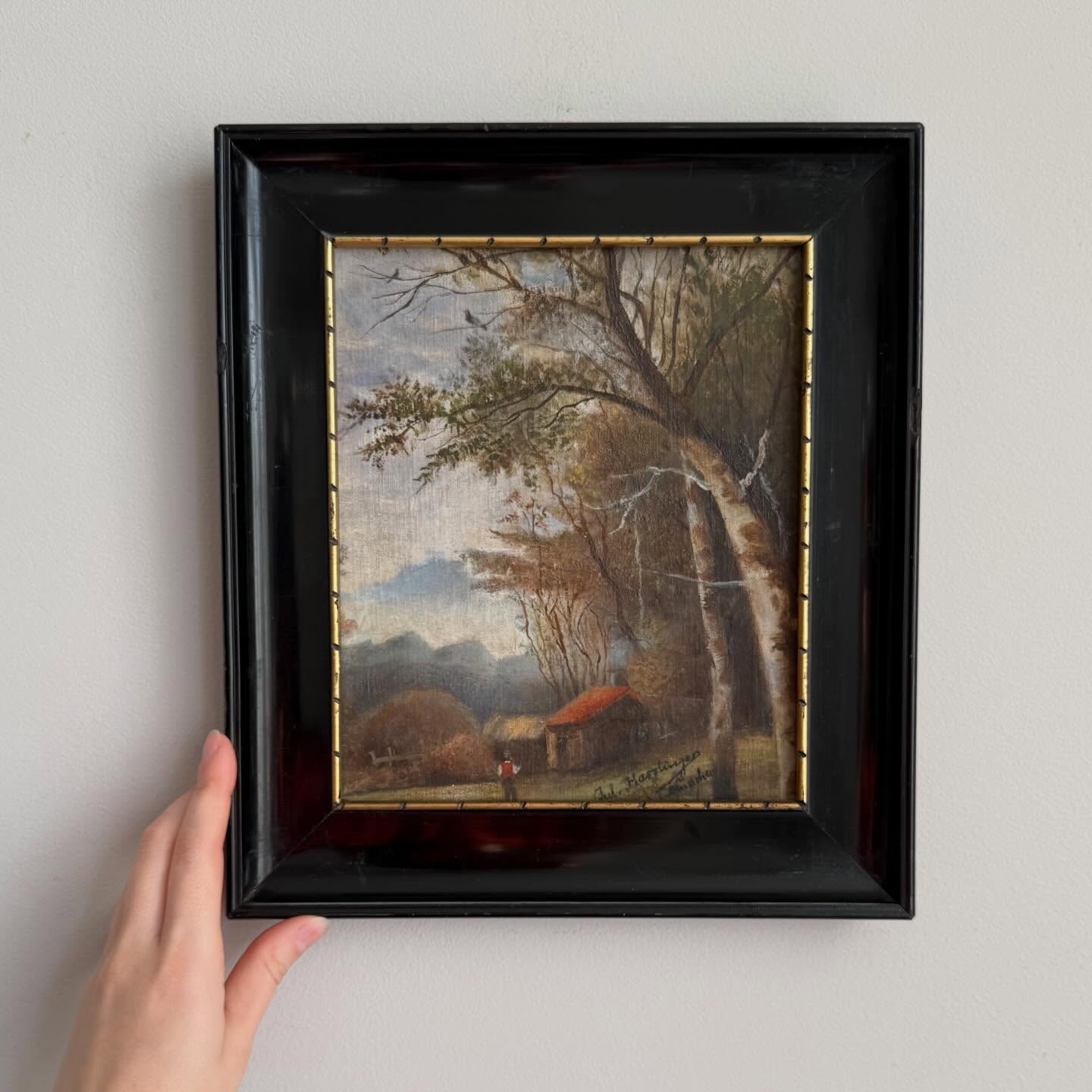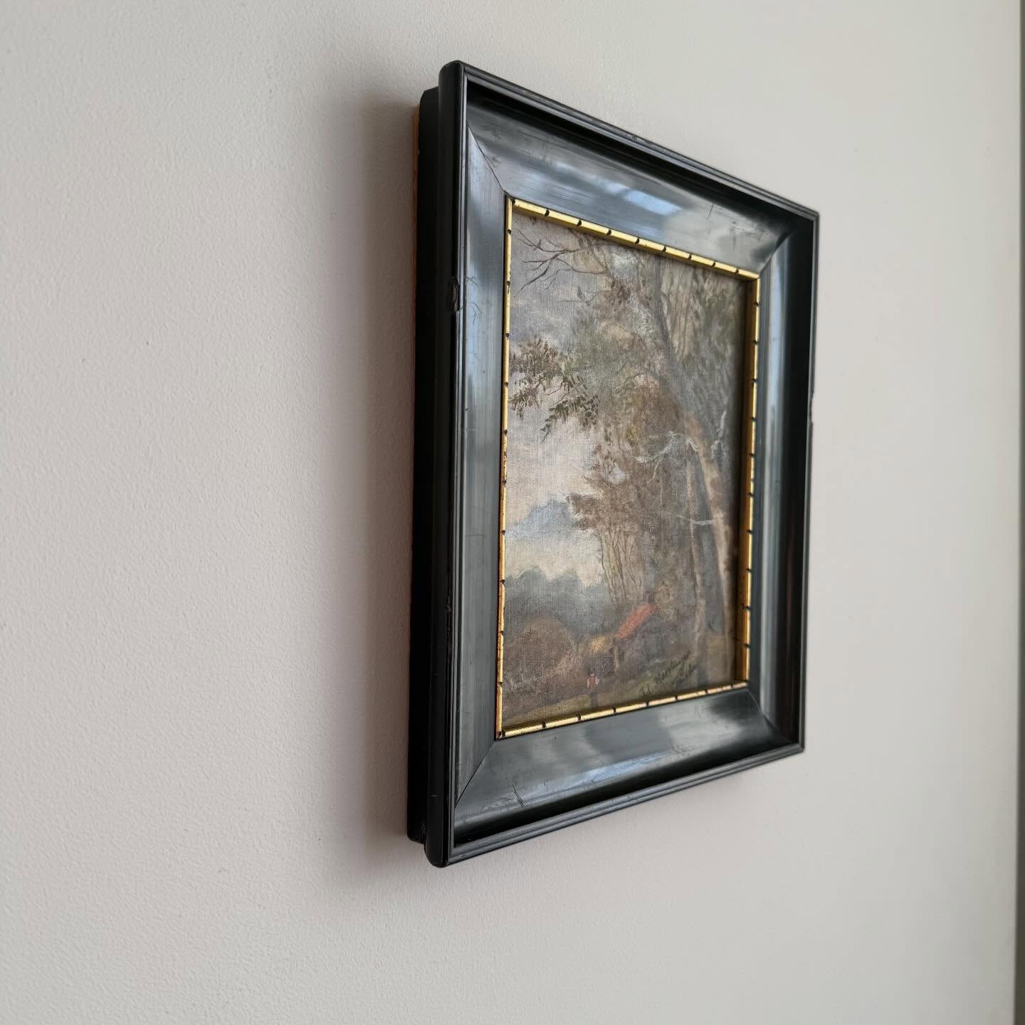 Ulei pe panză montată pe panou, ramă din lemn ebonizat cu bordură aurită, craquelure fină, mici uzurii ale ramei)